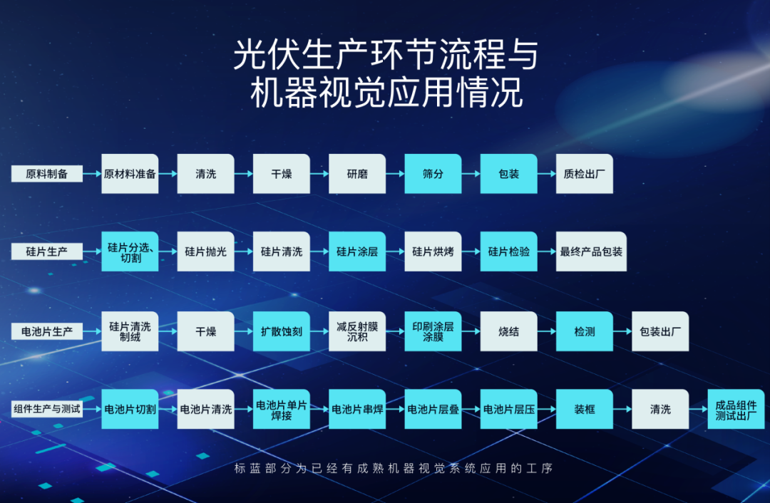 在視覺的應(yīng)用方向中,缺陷檢測(cè)的占比超過40%。在光伏產(chǎn)品的生產(chǎn)流程中,從硅片到組件生產(chǎn),均會(huì)大量應(yīng)用視覺缺陷檢測(cè)技術(shù)進(jìn)行質(zhì)量檢測(cè)。